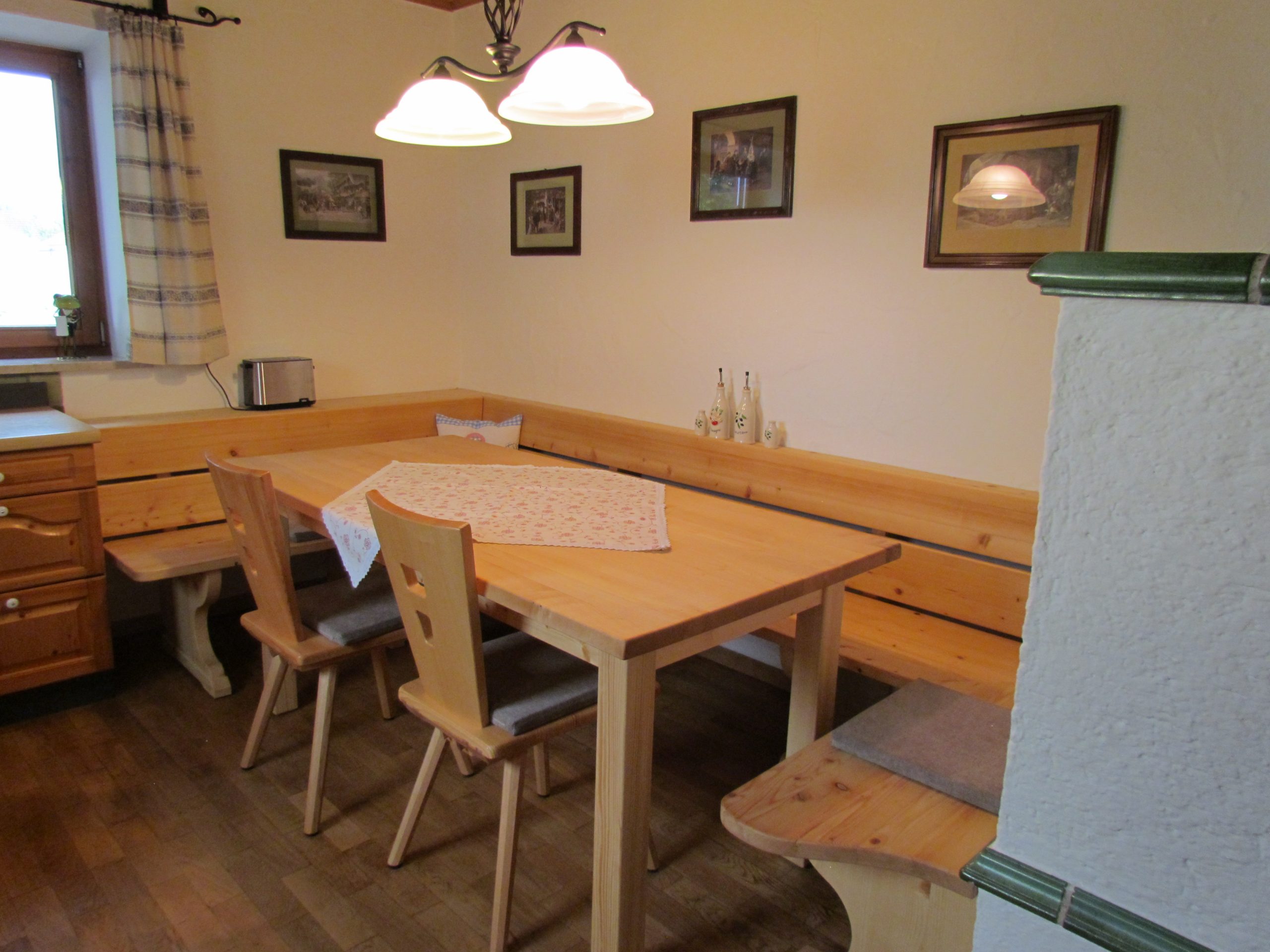 großer Esstisch mit Eckbank, Spülmaschine, Kühlschrank mit kleinem Gefrierfach, Herd (4 Platten) mit Backofen, Kaffeemaschine, Wasserkocher, Toaster - Wohnzimmer: